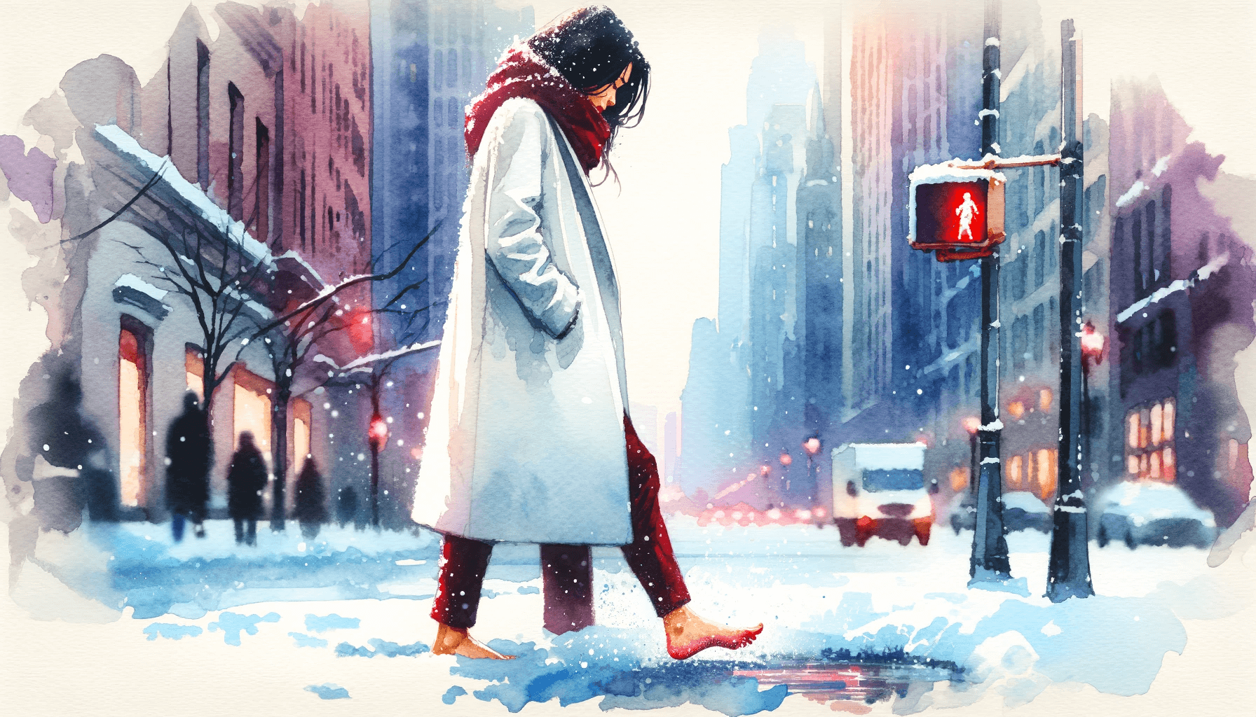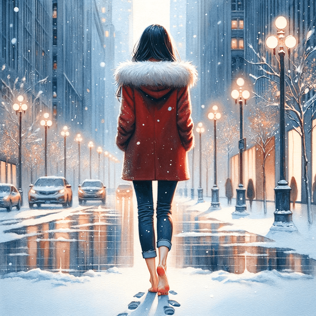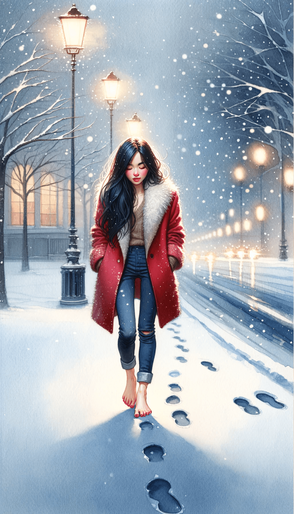 今天她穿着红色的大衣和牛仔裤,决定开始她的日常冒险。直接赤脚走出家门,寒冷的空气立刻包围了她,雪花在她的脚背上融化。街坊邻居看到她,已经不再惊讶,只是微笑着向她挥手。她回以一笑,自在地走向地铁站。