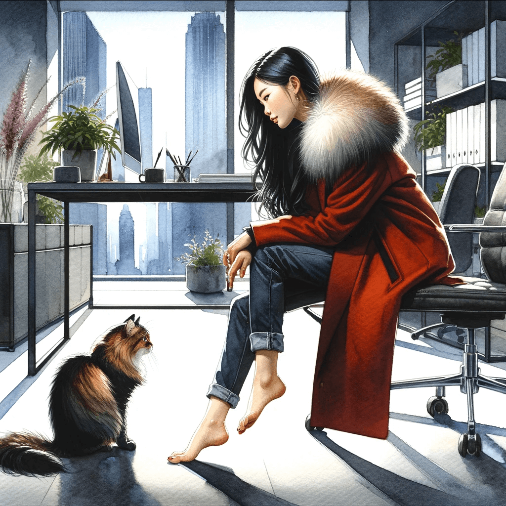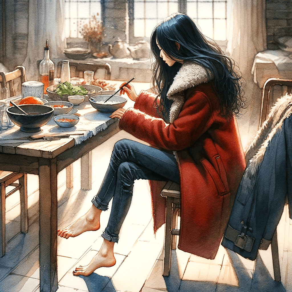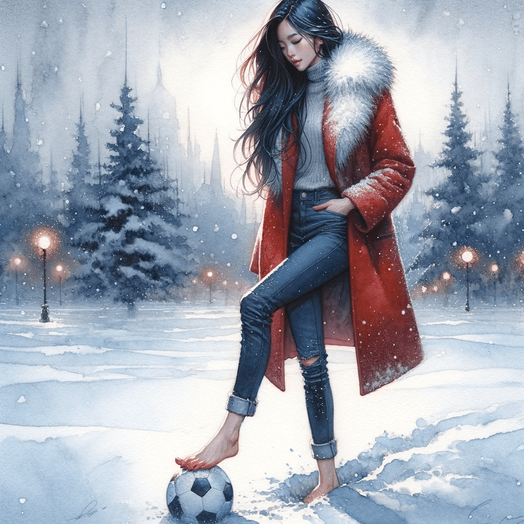 今天她穿着红色的大衣和牛仔裤,决定开始她的日常冒险。直接赤脚走出家门,寒冷的空气立刻包围了她,雪花在她的脚背上融化。街坊邻居看到她,已经不再惊讶,只是微笑着向她挥手。她回以一笑,自在地走向地铁站。