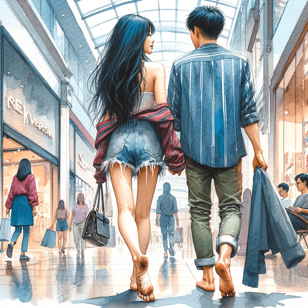 当晚,男朋友下班后与她相约在一家商场见面。尽管他已经习惯了她的赤脚习惯,但在商场的华丽装饰和热闹气氛中,晓婷的赤脚依旧显得格外突出。他们一起逛了许久,看着琳琅满目的商品,享受着两人的甜蜜时光。晚饭后,两人并肩走回家。路上的雪已被踩实,晓婷感到脚下传来的是冰凉而坚硬的触感,但这并未减弱她对这种赤脚生活方式的热爱。