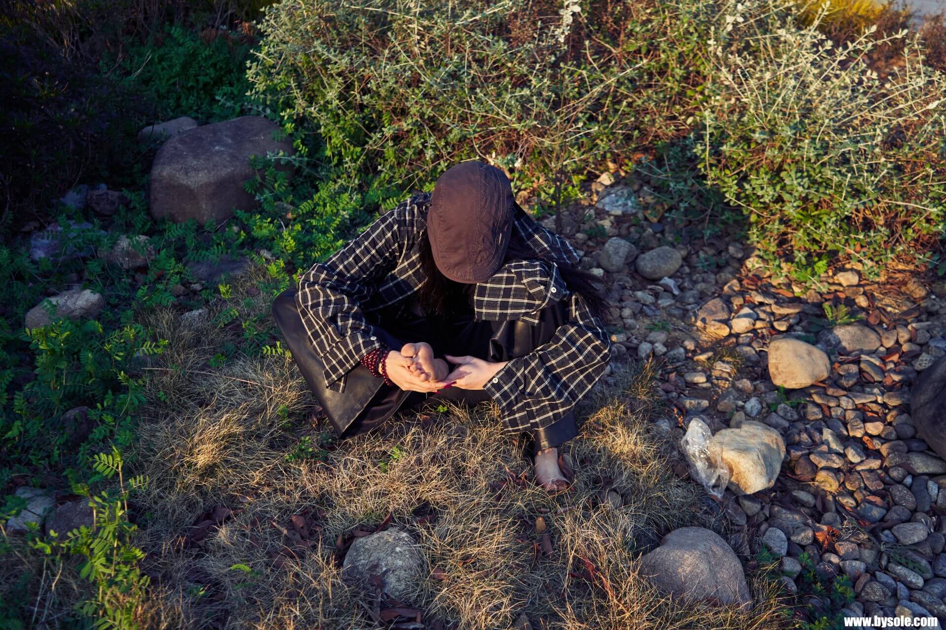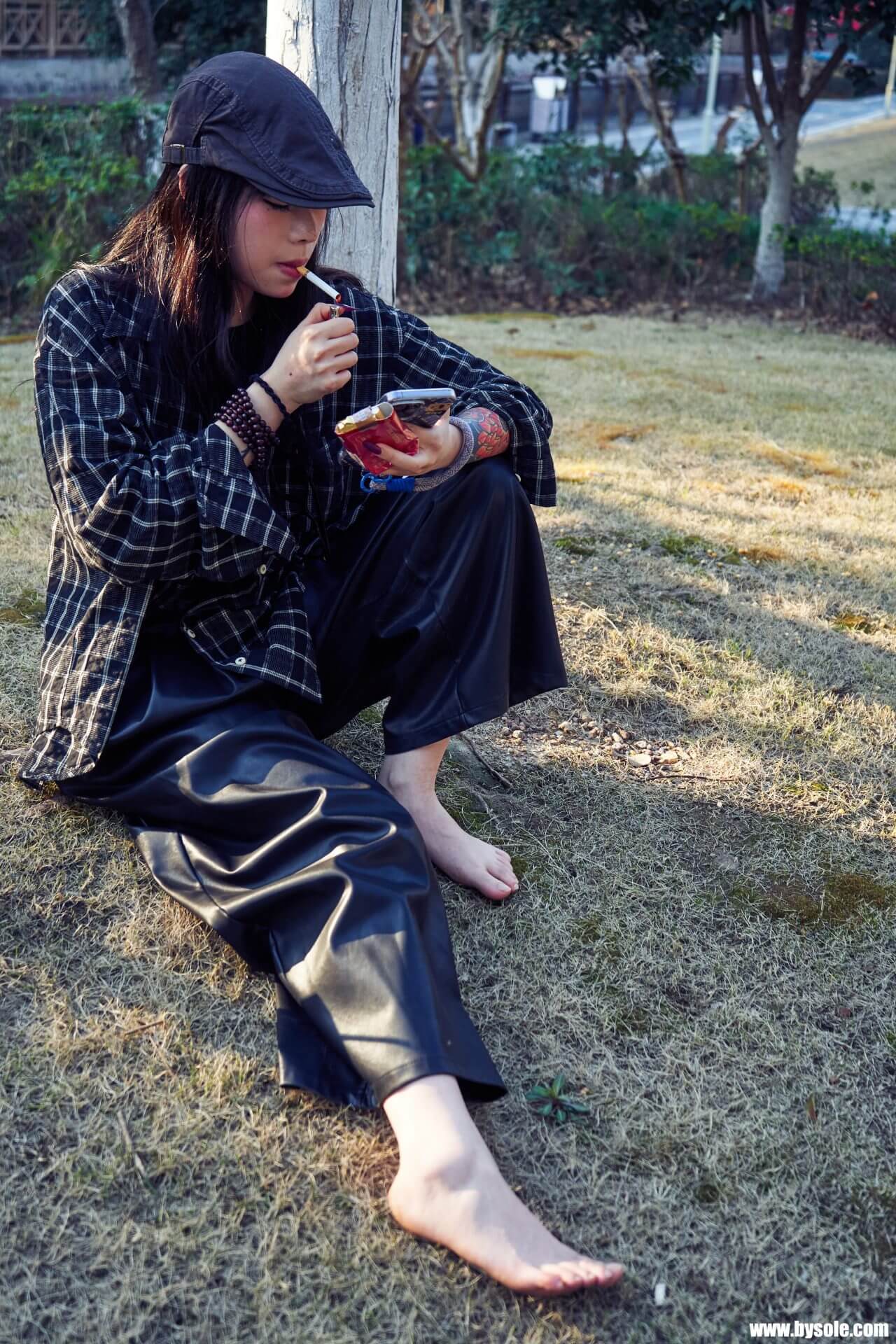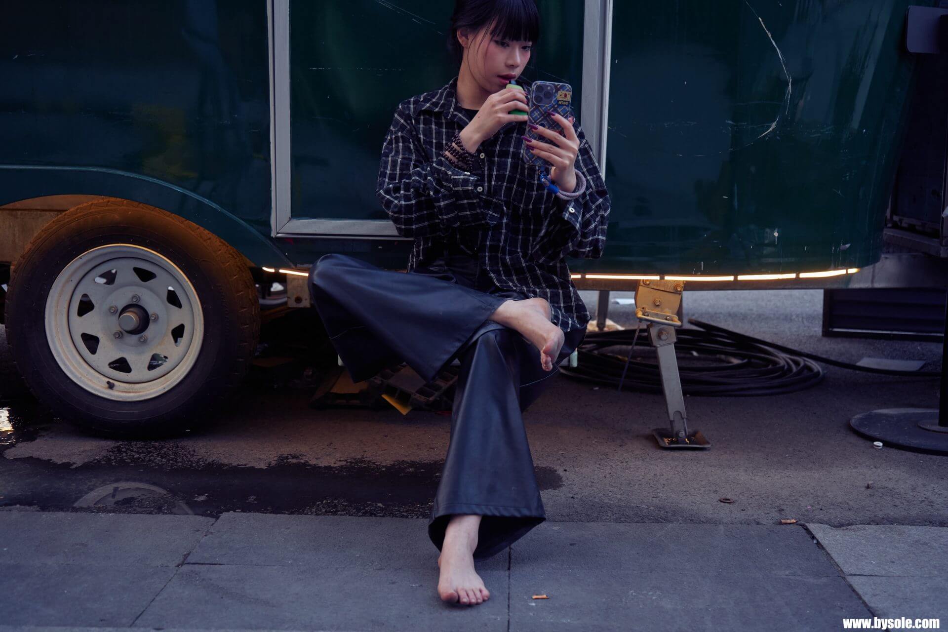 拍照片的时候,姜老师让我在一块大石头上摆 Pose。我先是站着,脚尖点地,皮裤配上赤脚,感觉自己有点酷酷的。然后我又坐下来,把脚伸直,故意露出脏兮兮的脚底。平时我爱看其他女孩子的脚丫,喜欢那种骨感和脚背上的筋,今天看着自己的脚,突然觉得也挺好看。阳光打在脚上,暖洋洋的,我忍不住用手摸了摸脚背,感受着皮肤的温度。