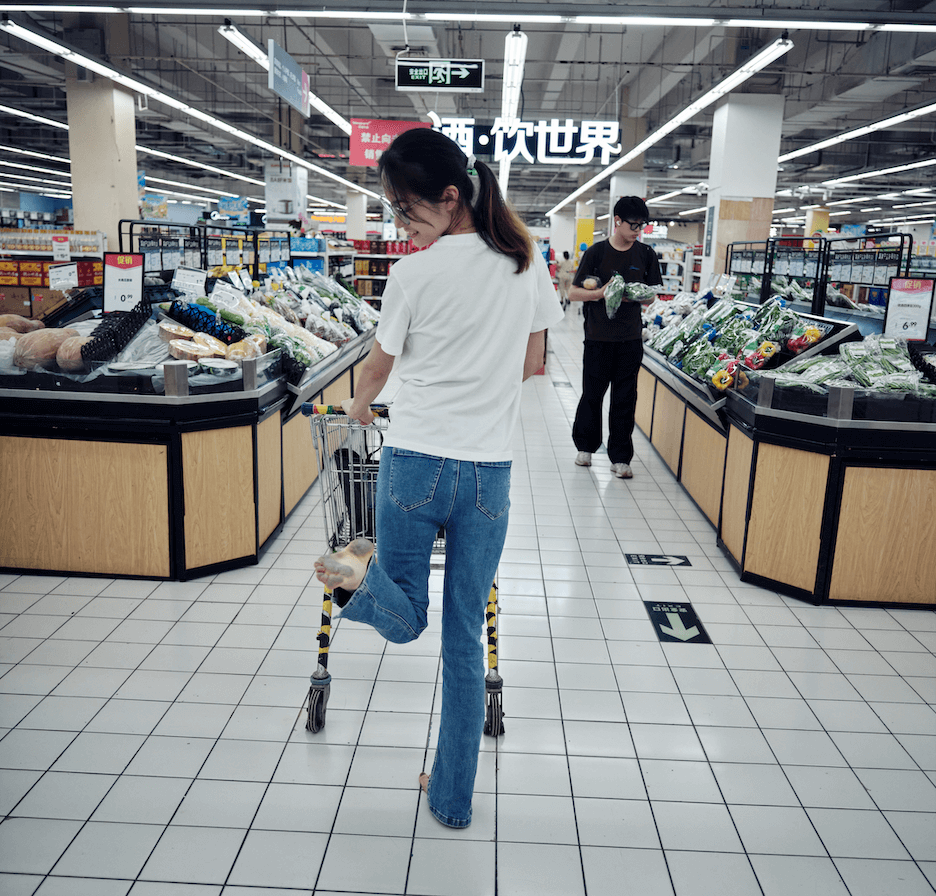 进到超市里,光脚踩在瓷砖上,凉凉滑滑的感觉传上来,特别清晰。每走一步都能感受到地面的质感,好像连平常最普通的一块砖都在跟我说话。我推着购物车随手拿了几瓶水,假装自己很自然,心里却很激动。