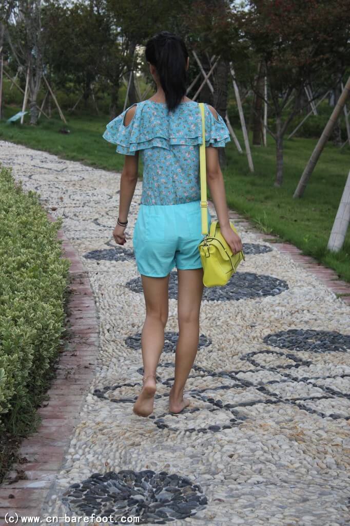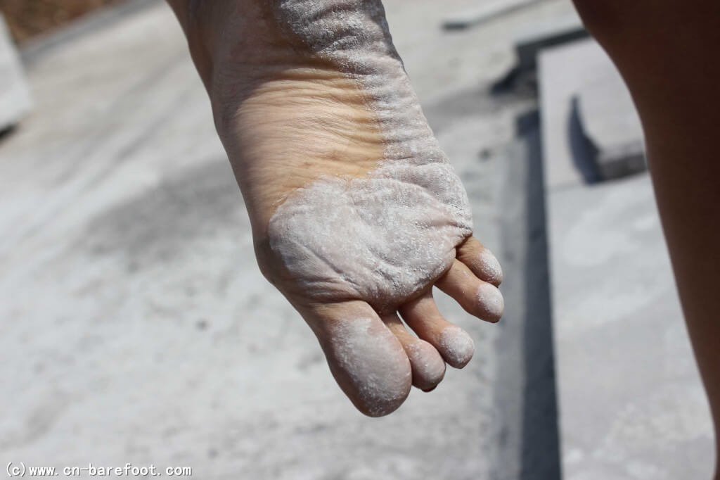 珠珠第一次尝试赤脚,来到一个正在修建的公园。她小心翼翼地踏入花坛,感受着脚底下柔软而湿润的泥土,泥土冰凉且富有弹性,让她感到新奇。随后,她好奇地走入建筑工地现场,在一片水泥中踩踏,粗糙的粉末在她脚底摩擦,带来一种全新的触感。虽然有点不习惯,但珠珠脸上还是洋溢着好奇和兴奋的笑容,享受着这次特别的体验。