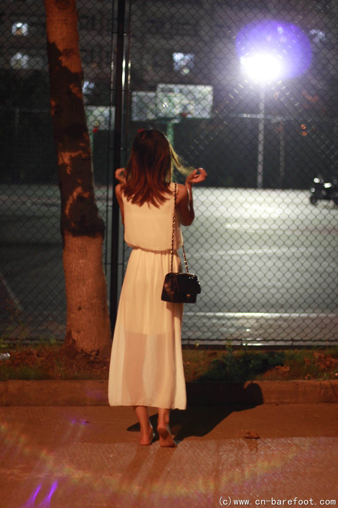 我们先沿着校外的一条街道走,那里有路灯,微黄的灯光使得画面很暖,她的脚在镜头中十分的美观。佳佳走路很小心,很爱干净,但是也阻挡不了灰尘往脚底粘的力量。白天十分炎热,到了晚上路面还是暖暖的,本来约在白天,后来为了避免把脚烫熟,我们改在了夜晚拍摄。
