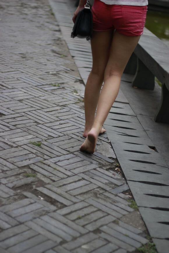 到湖边后,她洗了洗脚,然后我们又往回走,去等她男朋友一起回市区。绵绵的脚底很好看,小、黑、非常有质感,走路时经常习惯性的把右脚翻得向外,这样在后面很容易看到她美丽的脚底和各种动作。我们最后走到了原点,她坐在石凳上,把脚伸向我,我拍完视频和照片后与她聊了一会儿。后来她男朋友说就要过来了,于是我先告辞,带着作品与她告别。