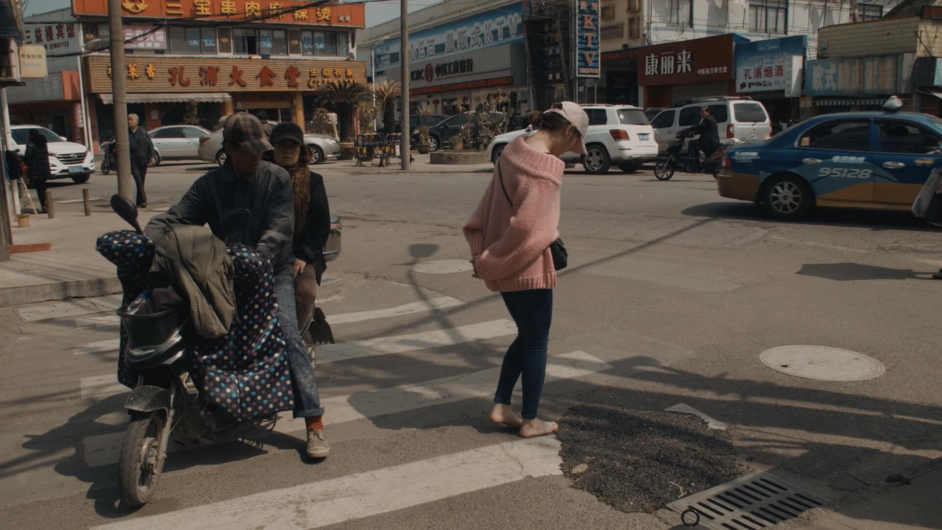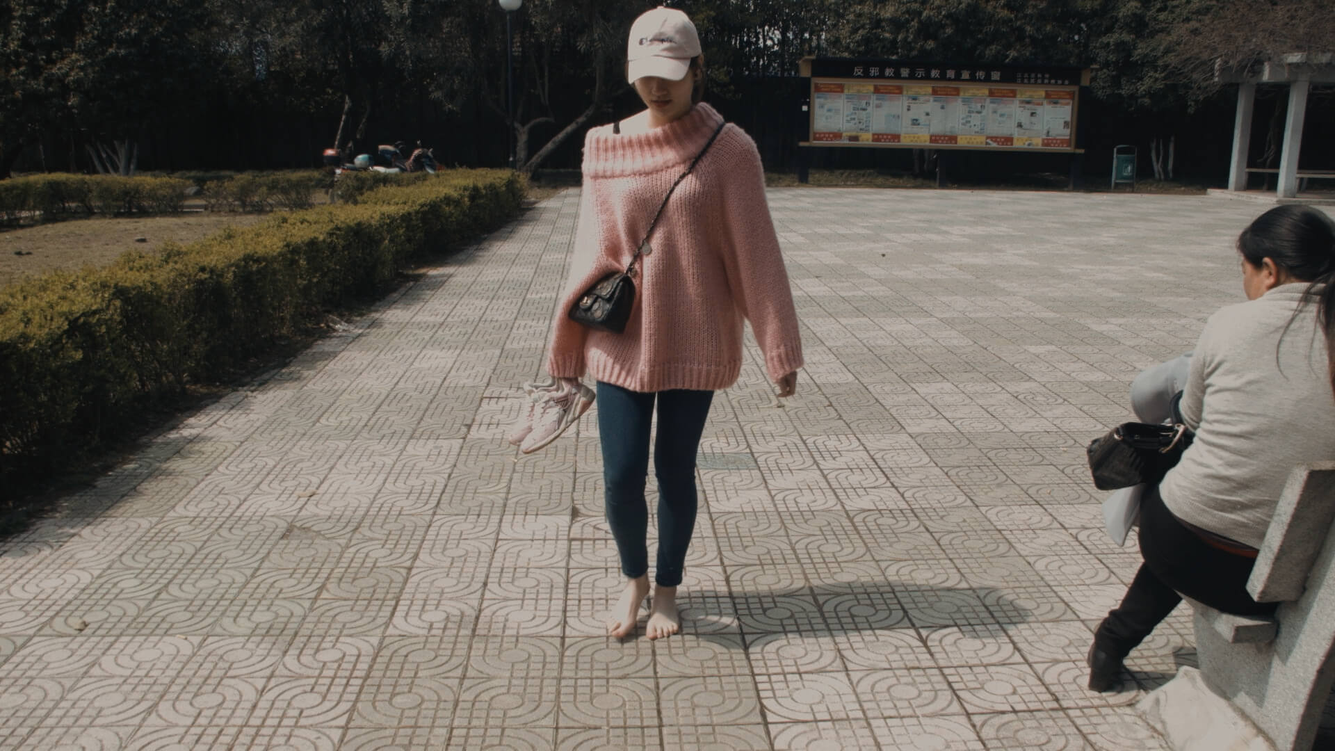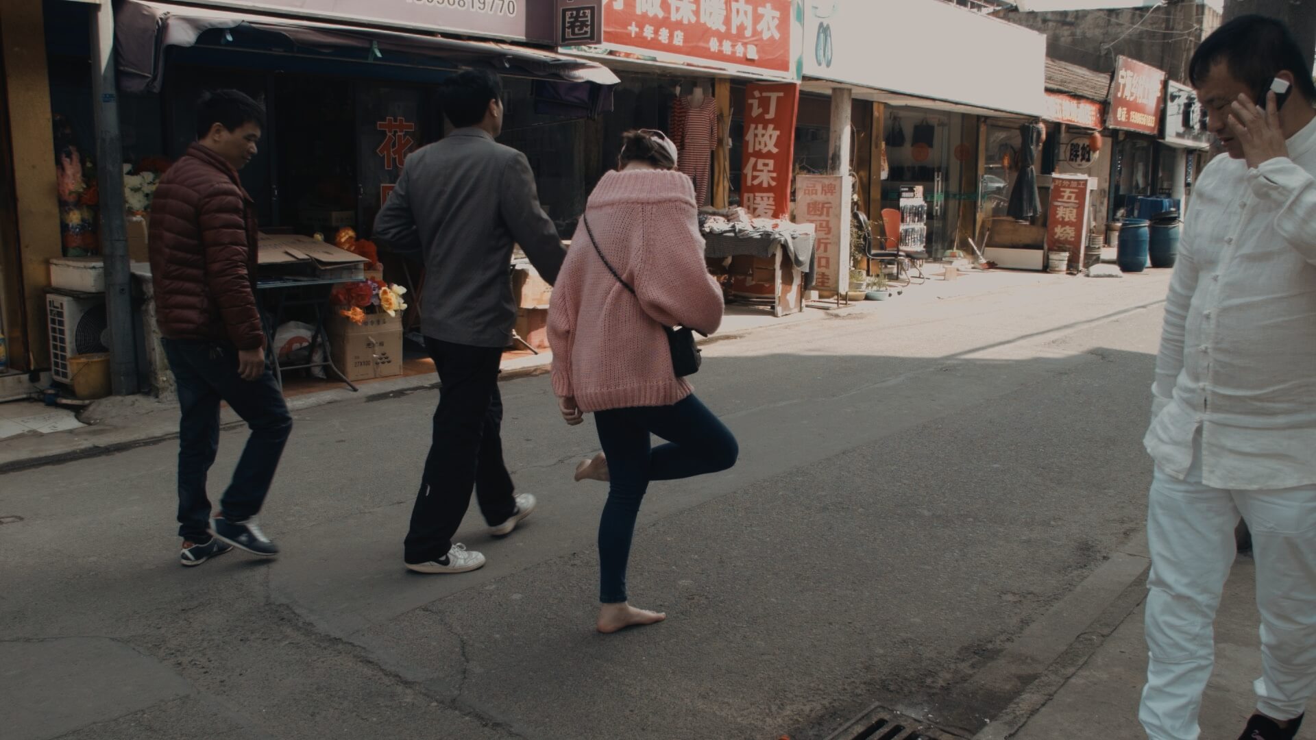 我们在一个公园开始,首先脱鞋,拎着鞋子在公园做适应性练习,然后把鞋子放在灌木下,走出去,上街。