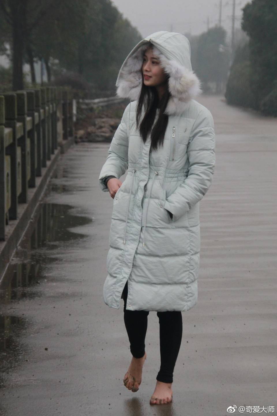 冬雨中,绵绵赤足走在乡村小道上。雨水轻柔地落在地面上,泥泞的小路因为雨水而变得湿滑,凉意顺着她的脚底传遍全身。乡村的空气中弥漫着雨后的清新气息,脚下的泥土软绵绵的,每一步都带着轻微的水声。尽管天气寒冷,绵绵却享受着这份宁静与自然的融合,感受着乡村冬雨中的别样温柔。