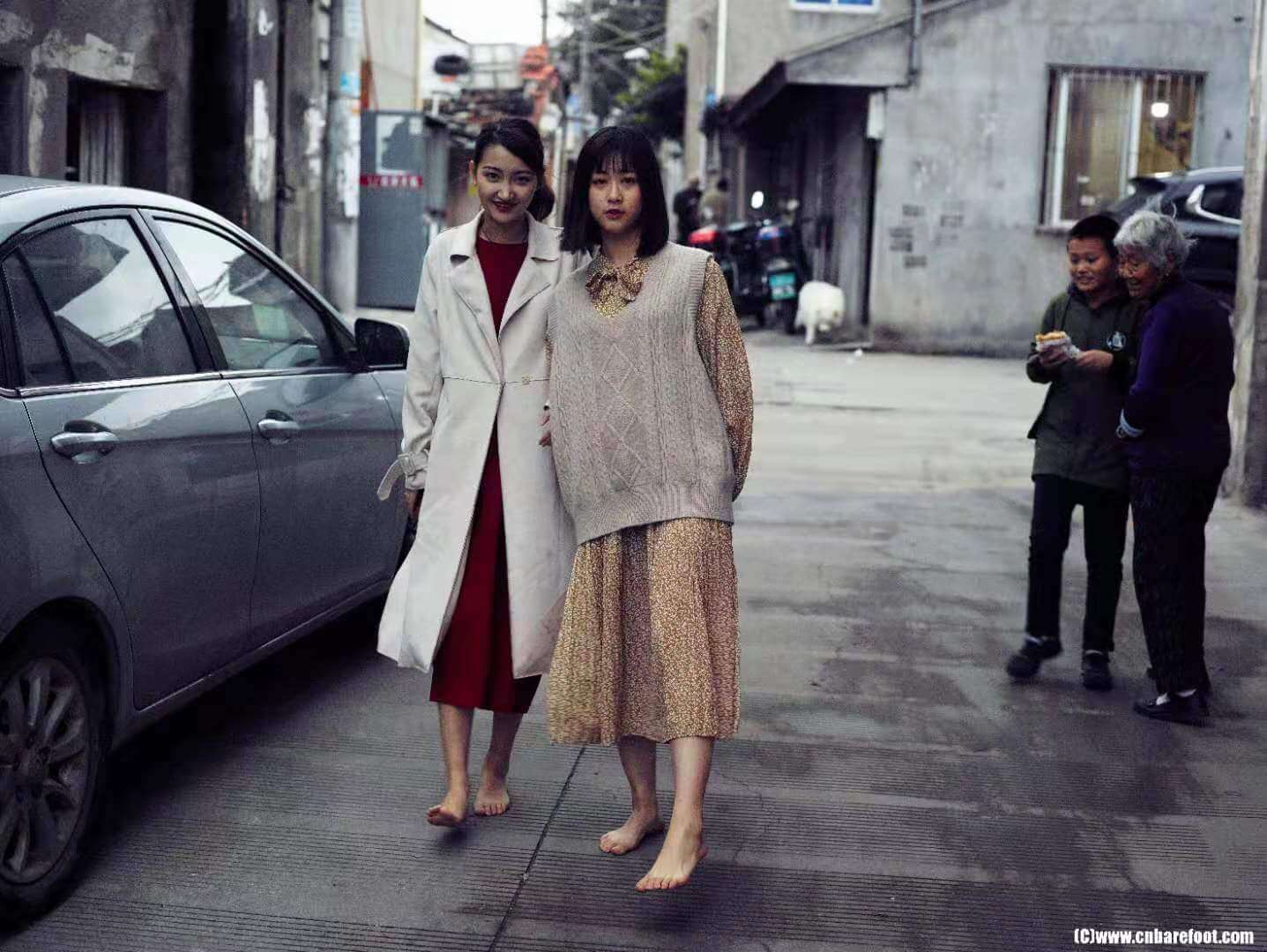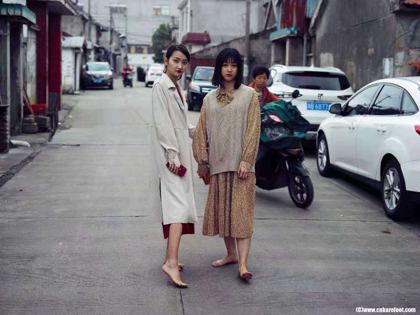 非常巧,两个模特都叫静静。正当拍摄顺利进行时,一个小插曲发生了——其中一位静静的脚趾不小心被车门夹了。虽然疼痛让她短暂皱了皱眉,但她很快调整状态,继续投入拍摄。
