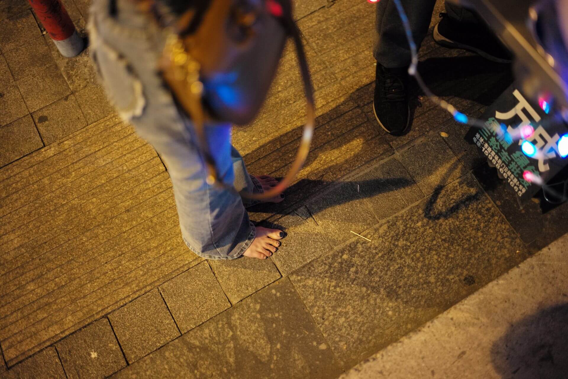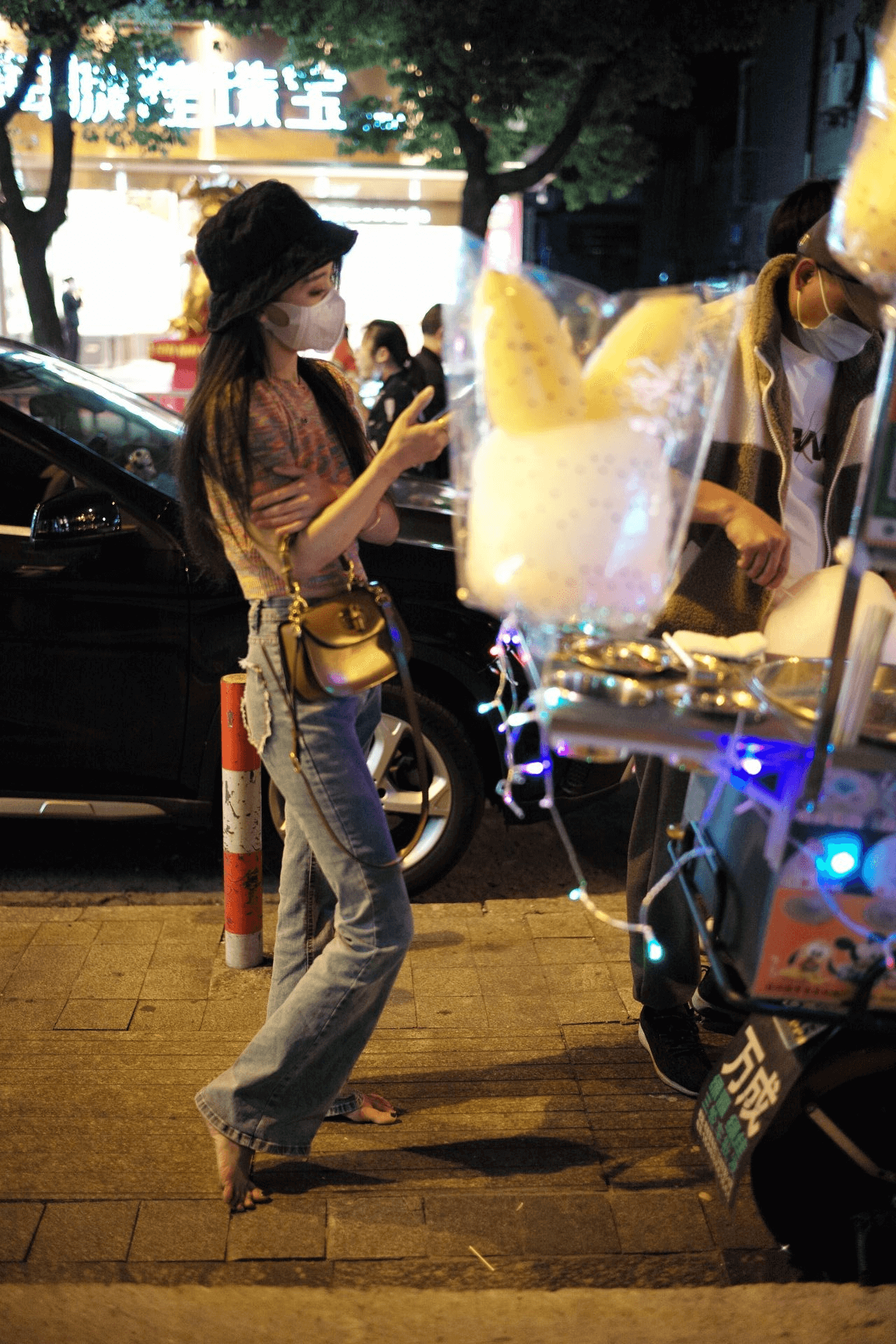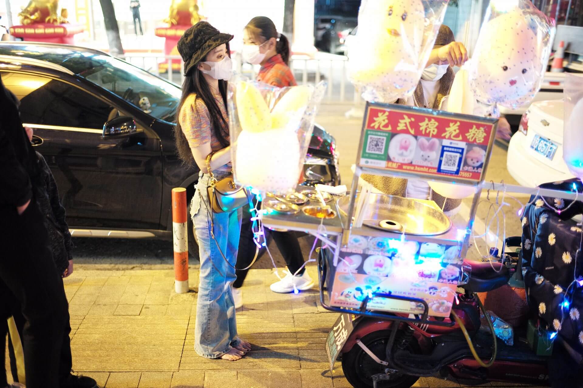 Fei-Fei went out for a barefoot walk in the evening and, on a whim, decided to go to a nail salon for a pedicure. First, she bought a cotton candy by the roadside. This set includes 9 minutes of video, provided for barefoot enthusiasts to reference and learn from.