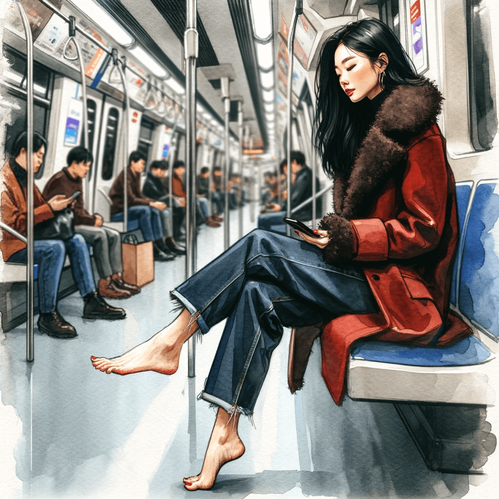 地下鉄駅の雰囲気は全く異なり、慌ただしい人々と喧騒が都市の交響曲を構成している。裸足で冷たい地面に足を踏み入れたその瞬間、彼女は自分が皆の視線の焦点になったと感じる。しかし、そんな視線の中で、彼女は強さと自信を学んだ。