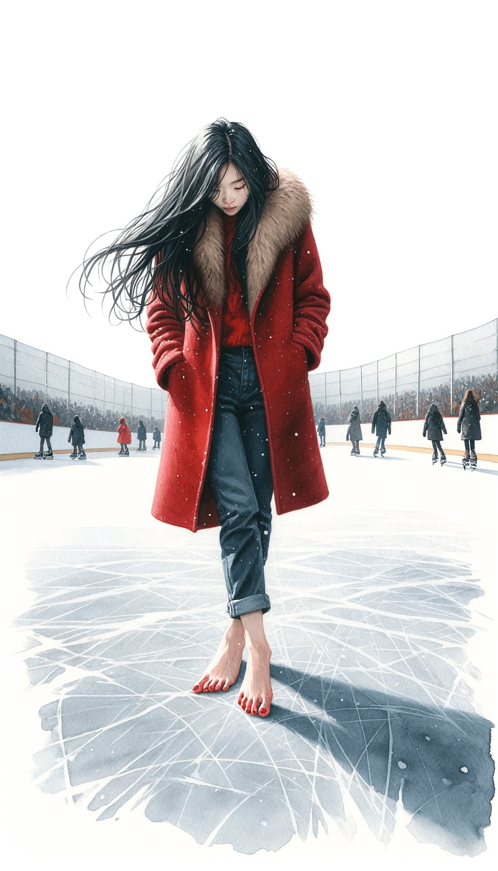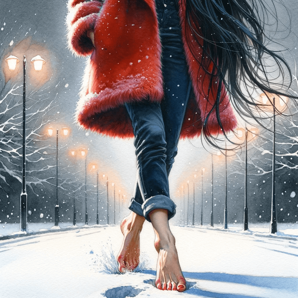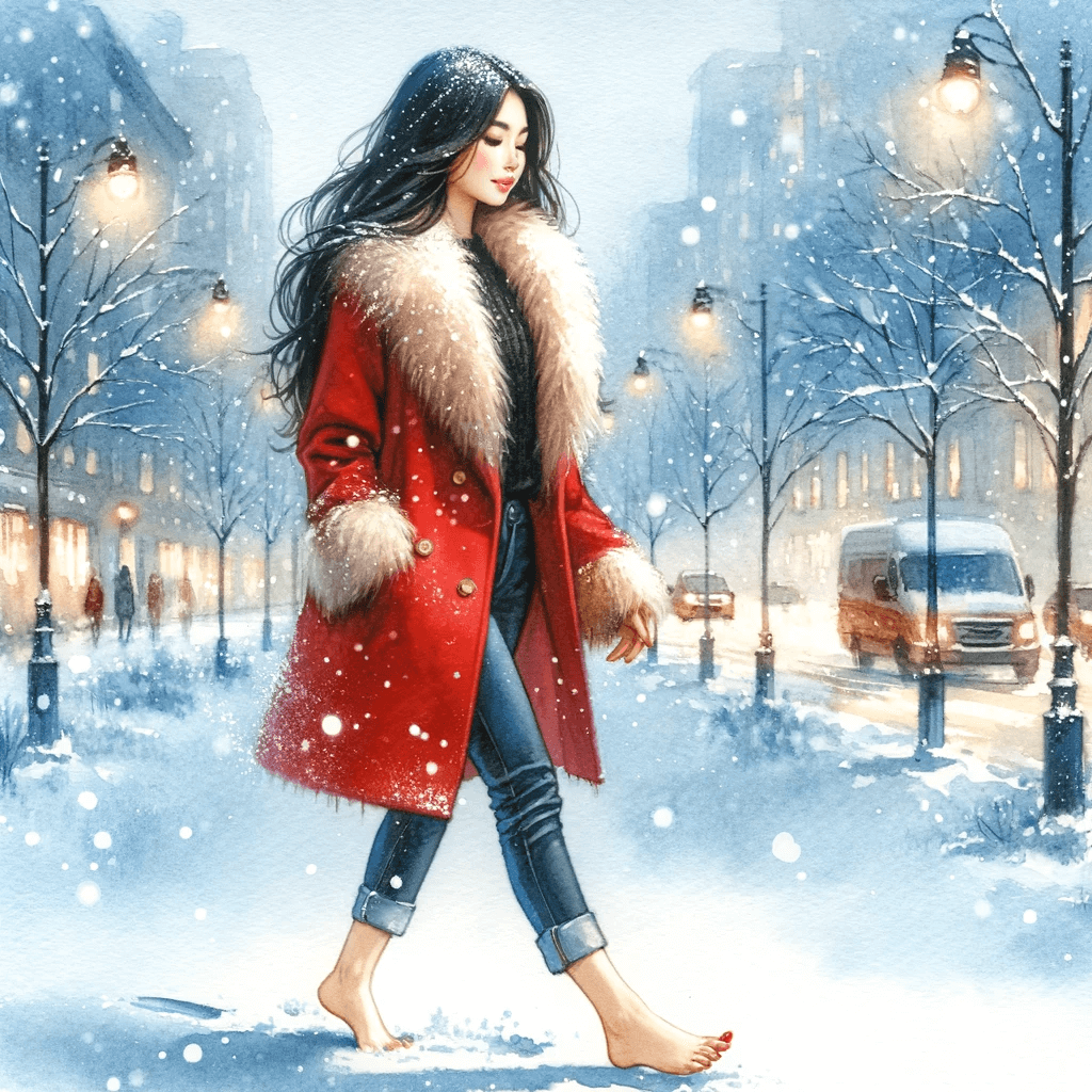 今日、彼女は赤いコートとジーンズを着て、日常の冒険を始めることにした。そのまま裸足で家を出ると、冷たい空気がすぐに彼女を包み、雪が彼女の足の甲で溶けていく。近所の人々は彼女を見ても、もはや驚くことはなく、ただ微笑んで手を振るだけだ。彼女も笑顔で応え、気楽に地下鉄駅へと向かう。
