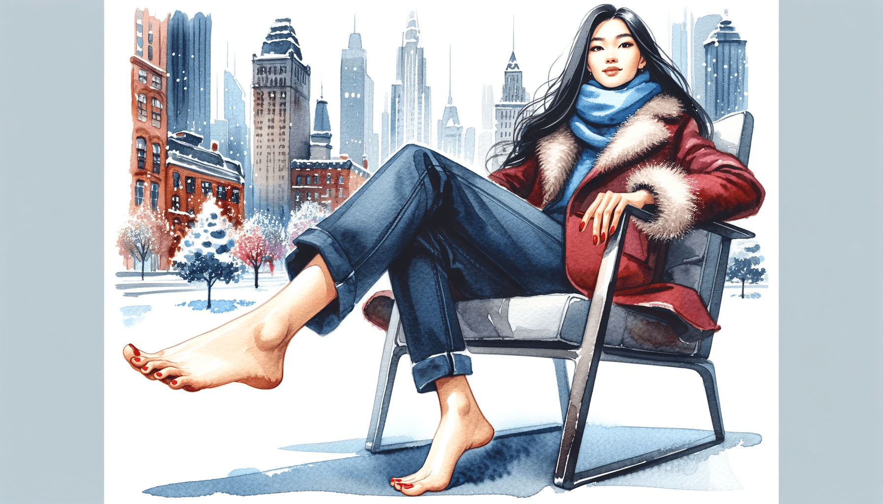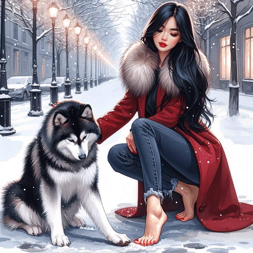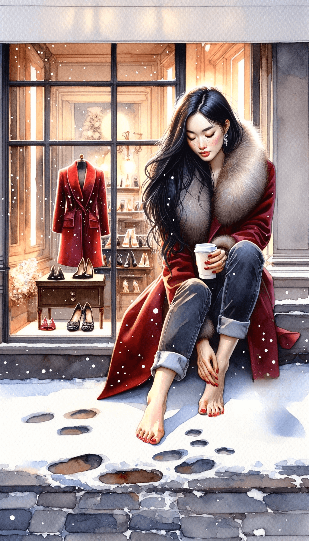 今日、彼女は赤いコートとジーンズを着て、日常の冒険を始めることにした。そのまま裸足で家を出ると、冷たい空気がすぐに彼女を包み、雪が彼女の足の甲で溶けていく。近所の人々は彼女を見ても、もはや驚くことはなく、ただ微笑んで手を振るだけだ。彼女も笑顔で応え、気楽に地下鉄駅へと向かう。
