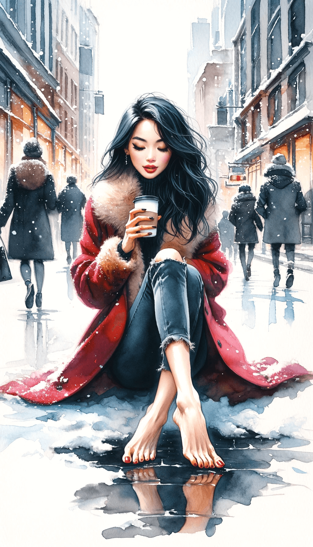 午後の時間はいつも長くて心地よい。カフェを出て、暁婷は歩道をゆっくりと散歩する。雪は次第に止み、湿って冷たい地面は一歩一歩を特に鮮明にする。彼女の裸足の歩みは、この都市に独特な足跡を残していく。