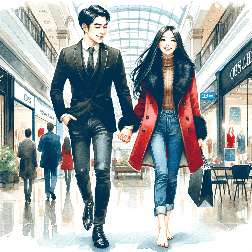 その夜、彼氏が仕事終わりに彼女とデパートで待ち合わせる。彼はすでに彼女の裸足の習慣には慣れていたが、デパートの華やかな装飾と賑やかな雰囲気の中では、暁婷の裸足はやはり特に際立って見える。二人は長い間一緒に買い物をし、所狭しと並ぶ商品を見ながら、二人だけの甘い時間を楽しむ。夕食後、二人は並んで家路につく。道の雪は踏み固められており、暁婷は足元から冷たくて硬い感触が伝わってくるのを感じるが、それでも彼女のこの裸足の生活様式への愛着は弱まらない。