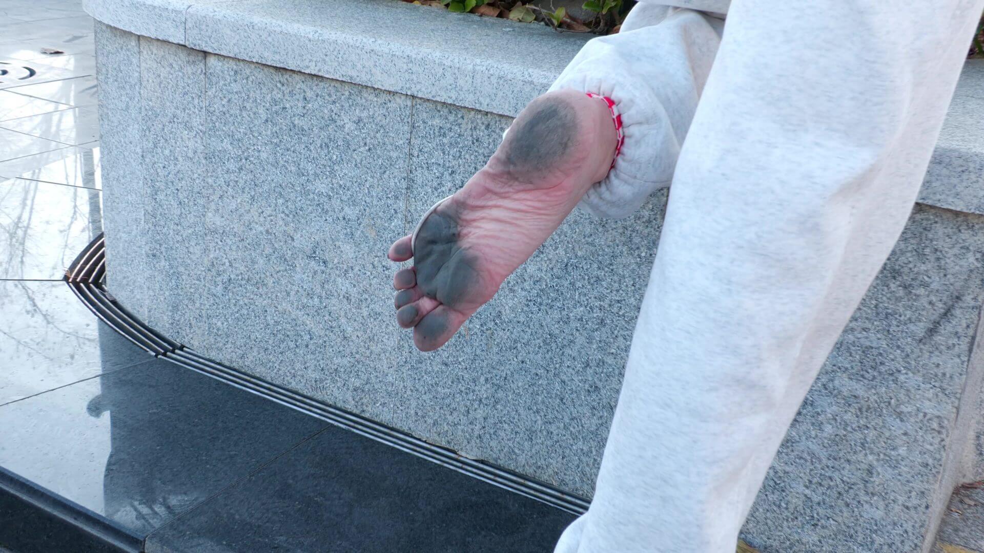 いたずら好きな菲菲は足の裏をもっと汚したくて、干上がった池に飛び込み、足で池底の埃を一生懸命擦りました。