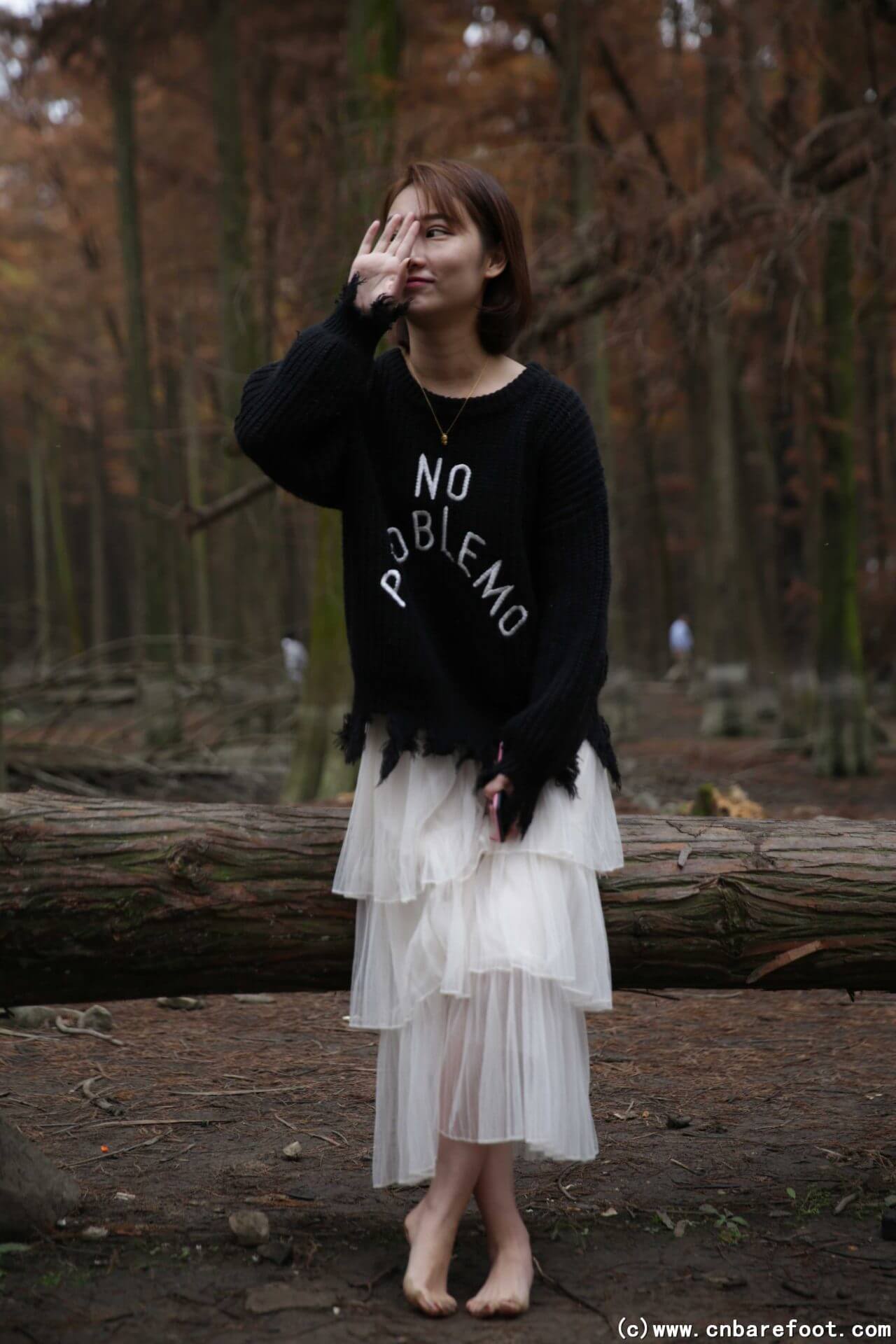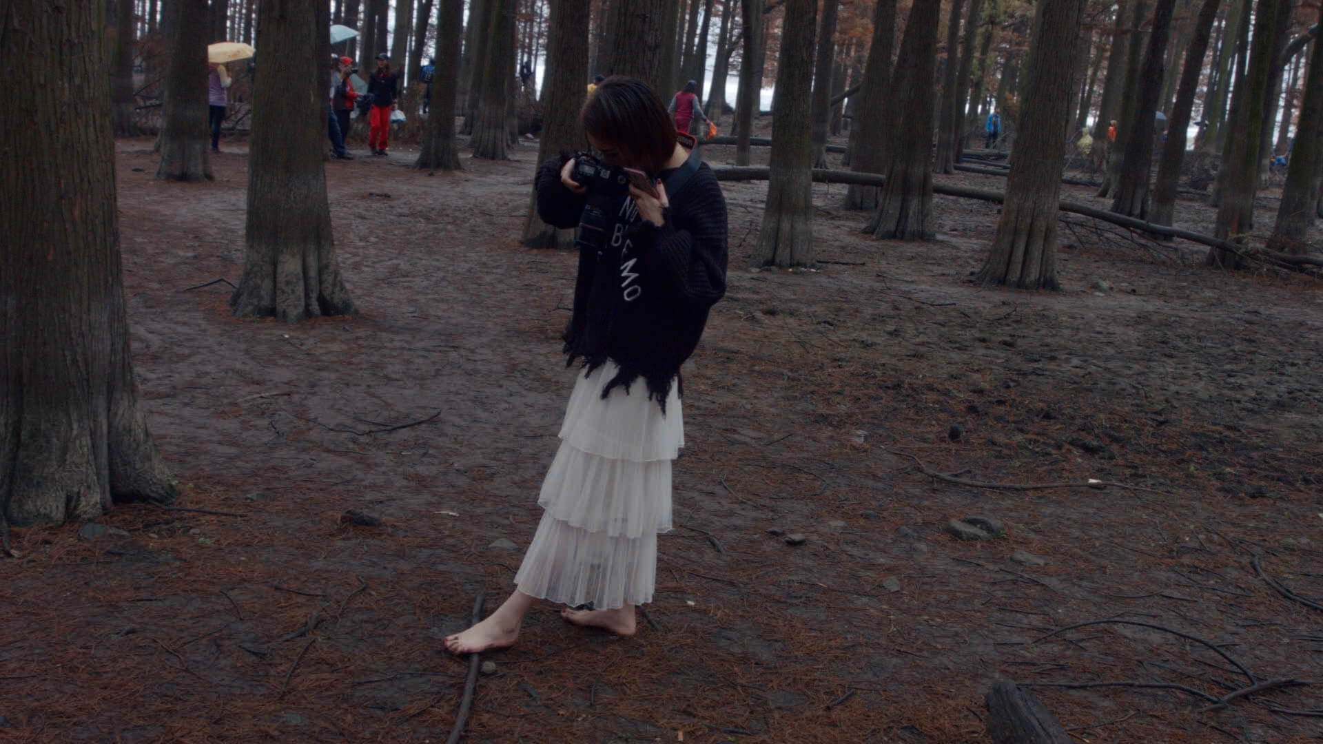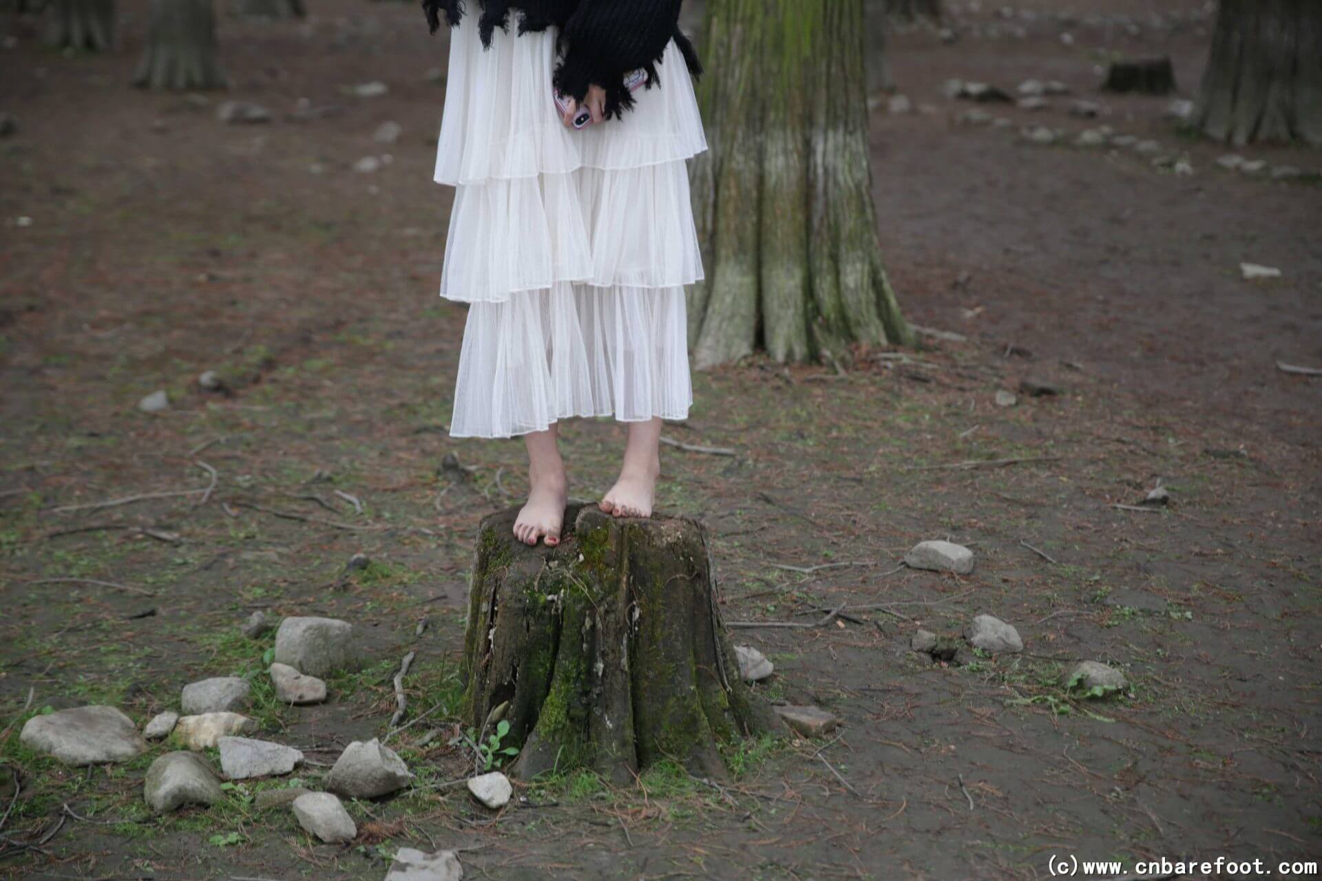 果果が裸足で冬のメタセコイア林を歩き、湿った土が足の指の間に入り込む。彼女は浅い水たまりにそっと足を踏み入れ、冷たい水が彼女の足の指を流れ、一陣の寒さをもたらす。林の中の空気は清々しく湿っており、周囲は静寂で、彼女の足音と土のわずかな摩擦音だけが林中に響き渡る。果果は大自然の純粋さと冬の寒さを感じ、この静かな森の中での独特な体験を楽しむ。