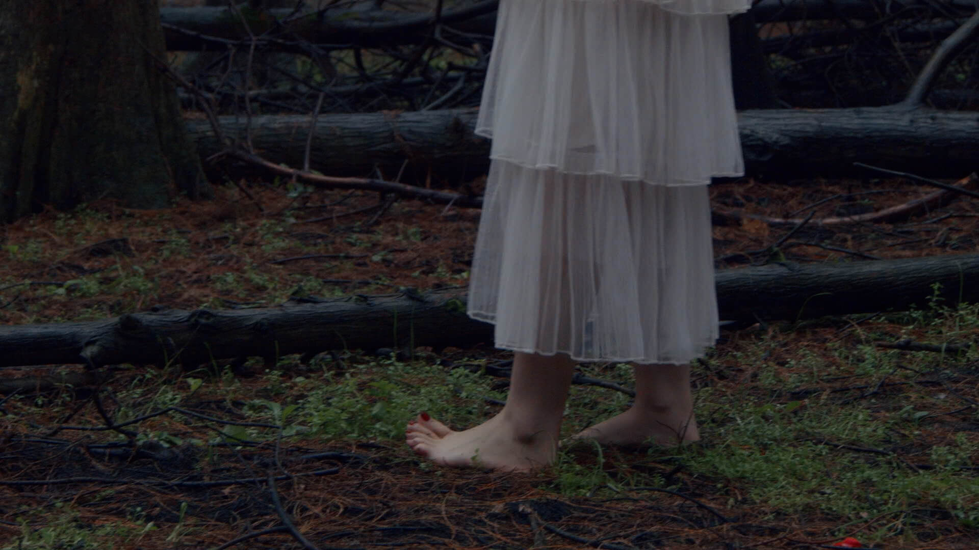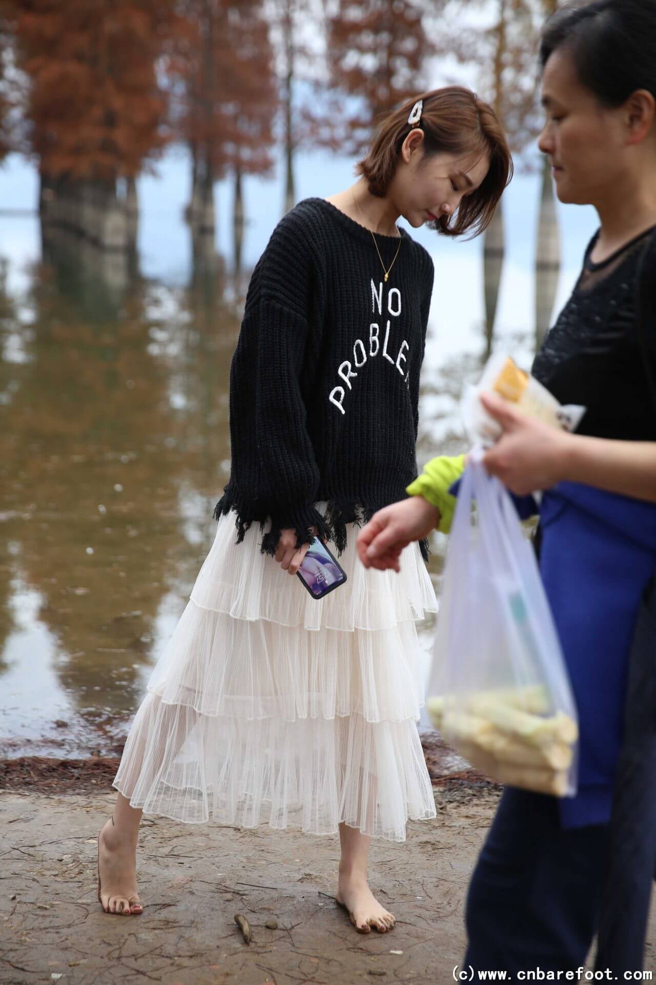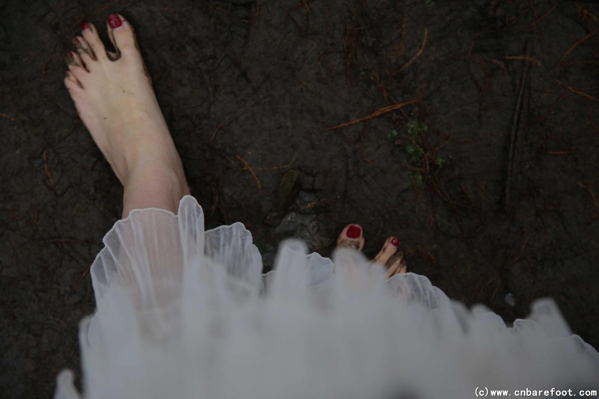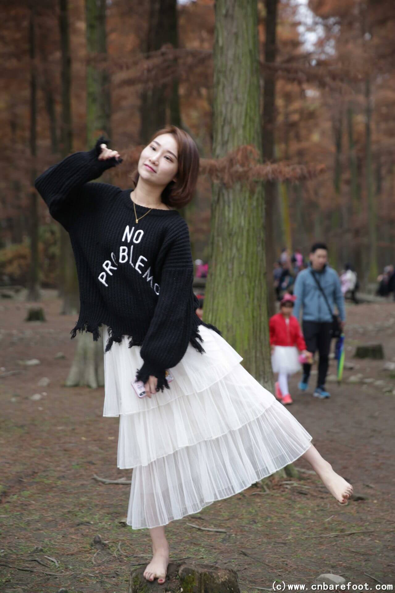 果果が裸足で冬のメタセコイア林を歩き、湿った土が足の指の間に入り込む。彼女は浅い水たまりにそっと足を踏み入れ、冷たい水が彼女の足の指を流れ、一陣の寒さをもたらす。林の中の空気は清々しく湿っており、周囲は静寂で、彼女の足音と土のわずかな摩擦音だけが林中に響き渡る。果果は大自然の純粋さと冬の寒さを感じ、この静かな森の中での独特な体験を楽しむ。
